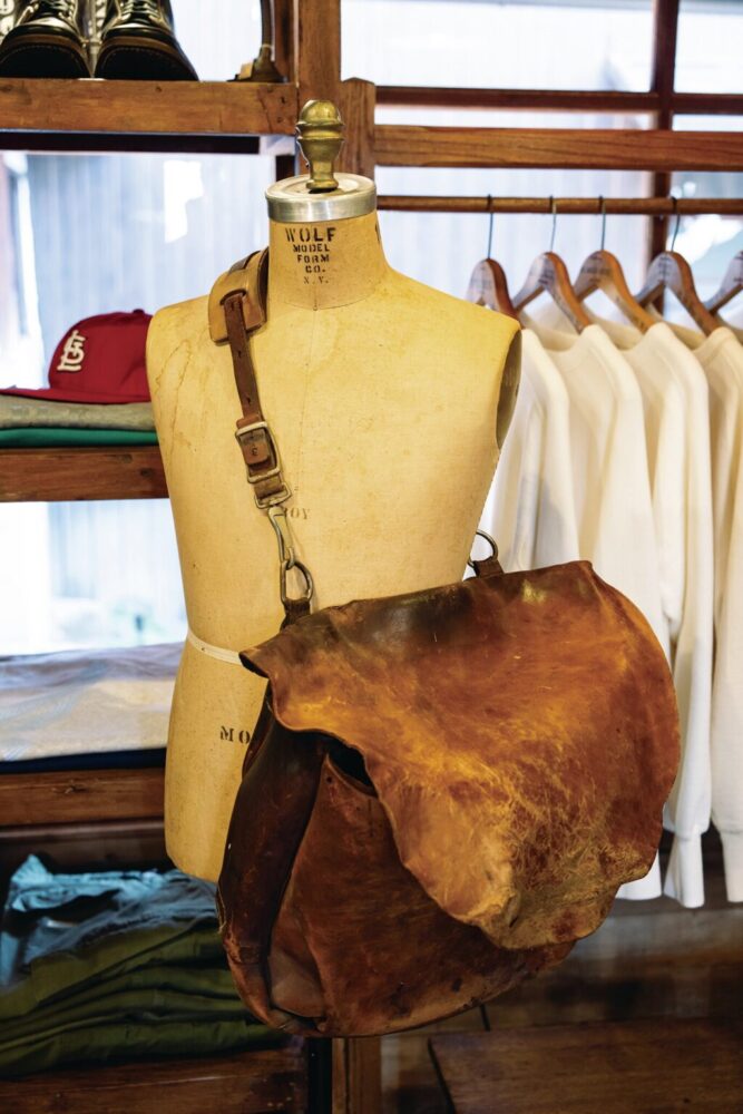 厚いレザーを使用したレザーショルダーはU.S.MAILのヴィンテージ。縫製がなく切りっぱなしのデザインのフラップが印象的。エイジングこそ見られるが革のコンディションは良く磨く楽しみも増えそうだ。¥38,800_