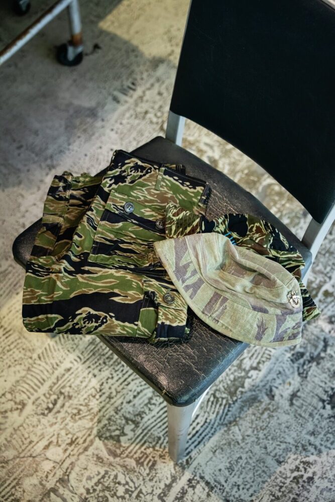 ベトナム戦争時代に特殊部隊が着用したタイガーストライプのパンツとハット。1960年代でありながら、希少価値が高く入手困難なアイテムのひとつ。¥69,990_/¥39,990_