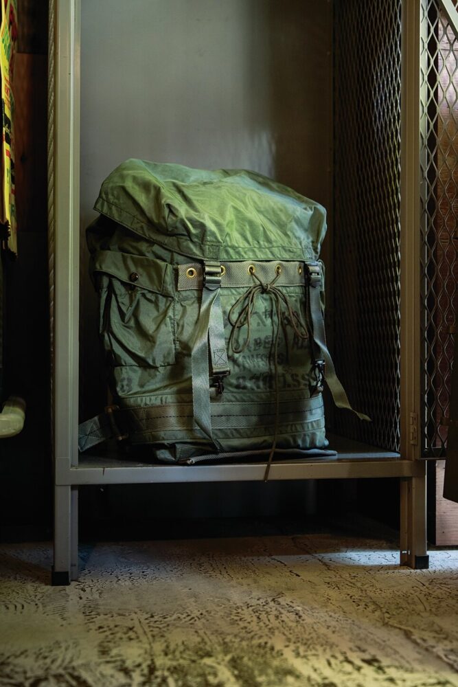 1967年モデルの超希少な空軍のバックパック。ライフルシリアルナンバーのステンシルプリントがほどこされ、サイドにはブラックラベルも付く。¥39,990_