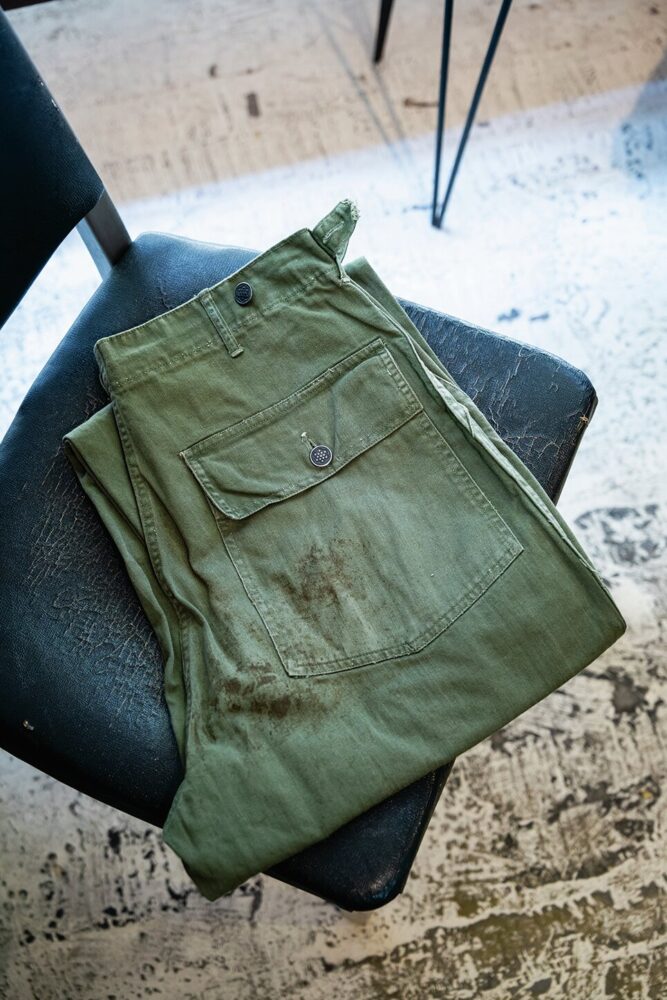 M-1947ヘリンボーンツイルトラウザース。1940年代を象徴する13スター黒ラッカーボタンを装備。特有のエイジングも楽しみなボトムスだ。¥24,990_
