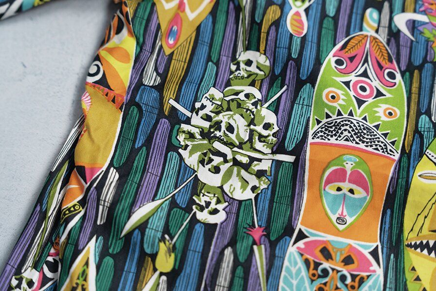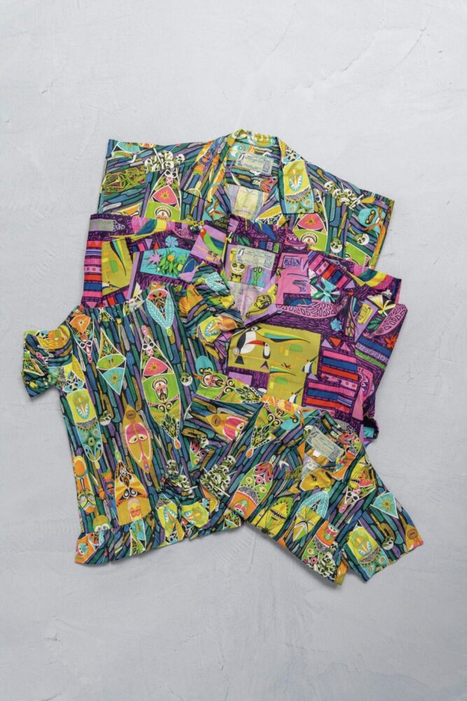 コットンハワイアンの最高峰となるディズニー柄のデッド。実はスカルが入っており、そこが高騰した理由。メンズ各¥594,000_、キッズ2点セット¥165,000_