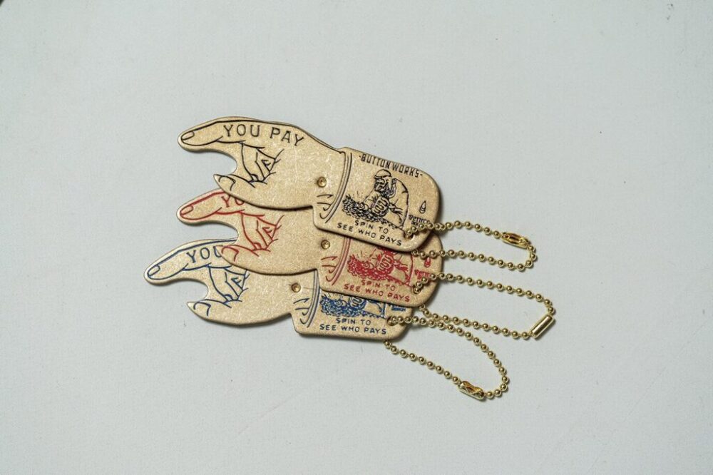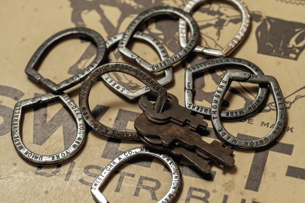 世界中の実力派ブランドたちがこぞって頼りするBUTTON WORKS。旧きよき時代のワークウエアにおける脇役であったボタン、ジップ、アドバタイジングなどの金属パーツをいち早く復刻したパイオニアだ。ディレクターを務める小菅氏は、インポーターとして活躍する傍らで、ヴィンテージのボタンなどを収集。その数は数千にもおよび、その豊富な知識と現代的なセンスを駆使しながら、精巧にリプロダクト。その代表作のひとつが、SWEET-ORRがノベルティとして配っていた馬蹄形のキーリングである。