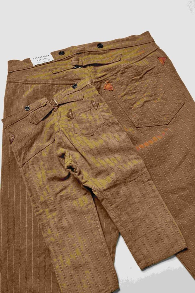 19世紀後半はデニムが労働着に使用され始めた時代だが、同社は他社が使用しないテキスタイルを使用して紳士衣料を製造し、その家族の幸せを想う気持ちをこの『First Pair of Pants』に込めた。奇跡的に現存していたこのアーカイブから新たなグリーンバウムブラザーズのオリジナリティを感じつつ、生地からすべて完全復刻を果たした。