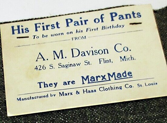 当時の『First Pair of Pants』に実際に付属したラベルのデッドストック。「初めてのパンツ – 1歳の誕生日に」としっかり記載されている。