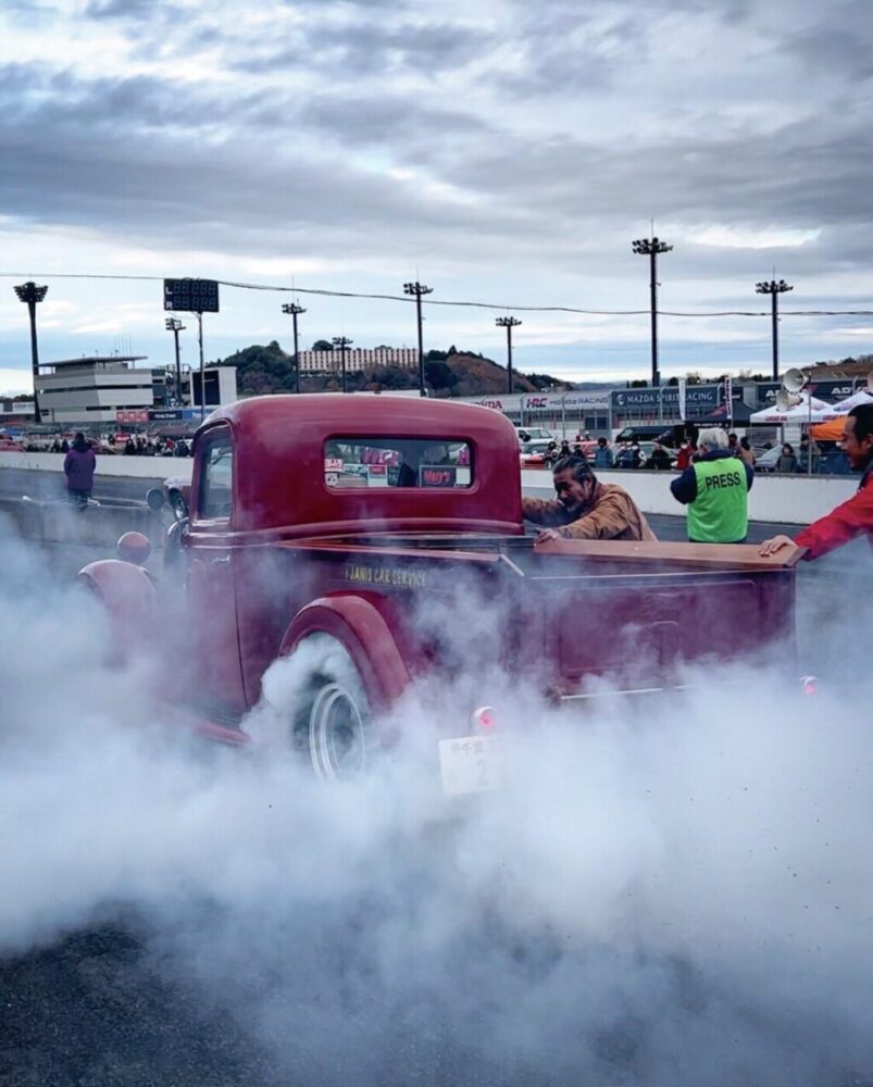 そして、ストックスタイルのバイクに対して、クルマは’60年代のドラッグレースをルーツとするギャッサーである。ギャッサーは当時NHRAのレースにて、ストリートレーサーを呼び込むために設けられたガスクラス(ガソリンスタンドで入手できる一般的なガソリンを使用)に端を発する。また、ガスクラスでは、灯火類の装備や4枚のフェンダーの装備、ホイールベースを変更しないことなど、ストリートリーガルを前提とするレギュレーションが定められていた。その中で高性能なグリップ力のタイヤがない時代に、フロントを上げてリアにトラクションをかけることを狙ったモディファイが、この’36年FORDに見られる’60sギャッサースタイルである。日本ではあまり馴染みがないが、松井氏は長年アメリカのドラッグレースに憧れを抱き、雑誌を読み漁り、国内のレースに通い続けていたため、初めてのアメリカ車でギャッサーを目指したのは必然だった。5年前に車両を手に入れてすぐ千葉県のジャニスカーサービスに持ち込んだ。当時の時代考証を踏まえたストリート&ストリップをコンセプトにモディファイを重ねながら街乗りや通勤の足として使用し、国内のドラッグレースにも参戦し続けている。