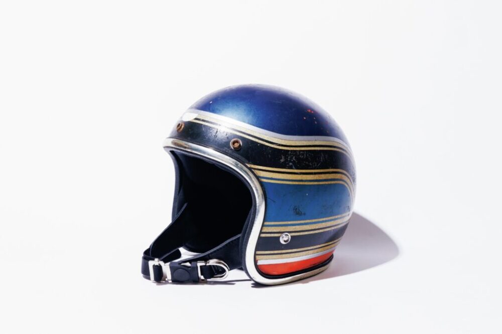 eBayでヴィンテージのヘルメットを探した。ブルーを基調としたカラーとストライプのデザインが目に止まった。しかし、ネットでのヘルメット購入はギャンブル。サイズやコンディションの判断が難しい。結局、神戸で内装レストアを依頼した。