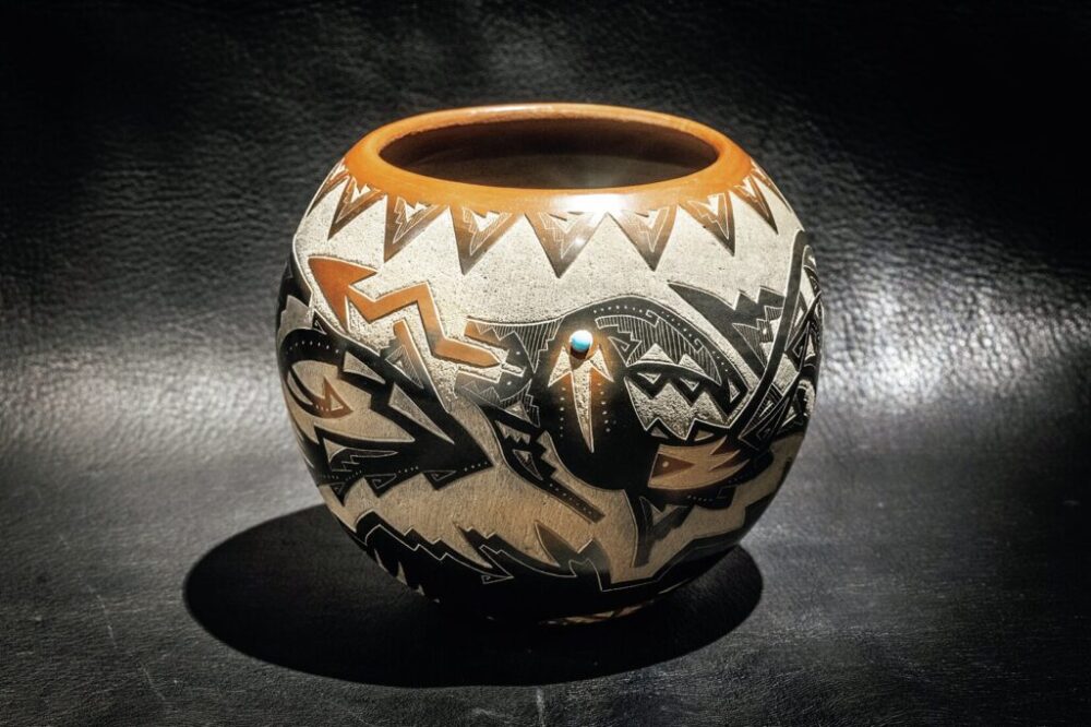 サンタクララプエブロの陶芸家に依頼したポッタリー。伝統的な焼成技法や手で捻るコイル技法で制作。左のツートンカラーは色を出すのが、とても難しく、技術や感覚が必要となる。右のブラックは、当部族の伝統的な色で、その色出しの美しさに定評。ともに参考商品