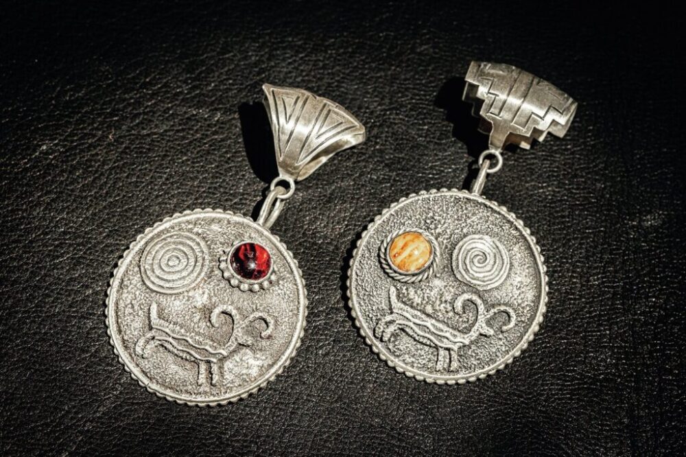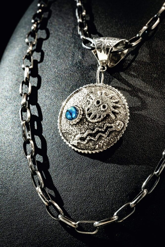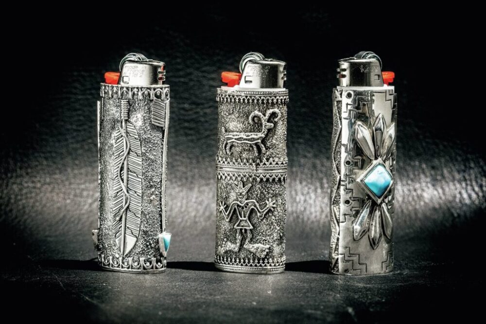 腕利きのトニー・チノに依頼。アコマの聖地に伝わるペトログリフ(壁画)からインスパイアされたデザイン。旅をした際に手に入れた材料を織り交ぜるのも彼の個性だ。ペンダント各¥143,000_、ライターケース右/¥176,000_、左/¥253,000_