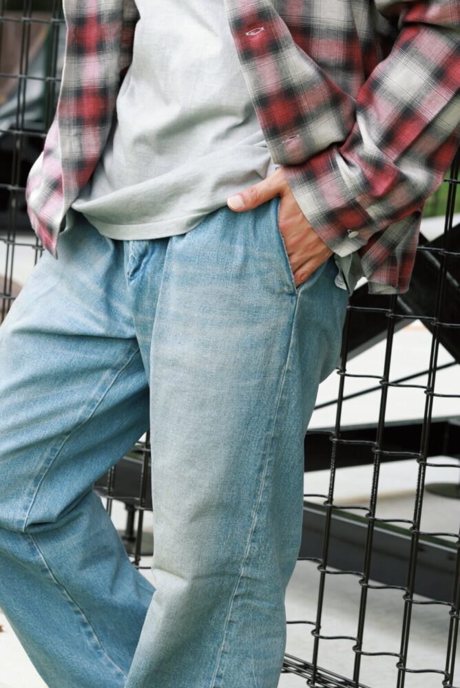 ゆったりとしたヒップ、モモ部分に膝下からややテーパードをかけ、すっきりとしたシルエットに仕上がっているジェントルパンツ。リアルに穿き込み、ある程度馴染んだウォッシュ加工は「’70年代ウォッシュ」と名付けられ表情も抜群だ。