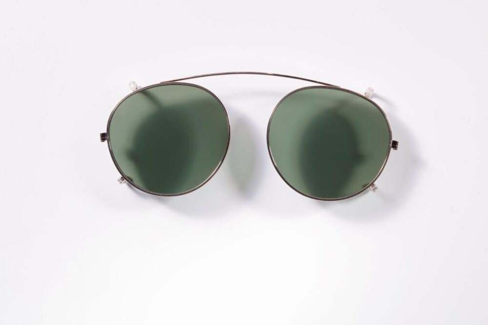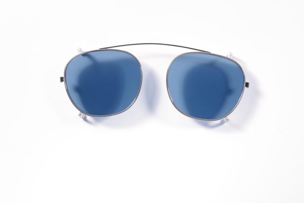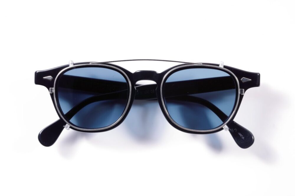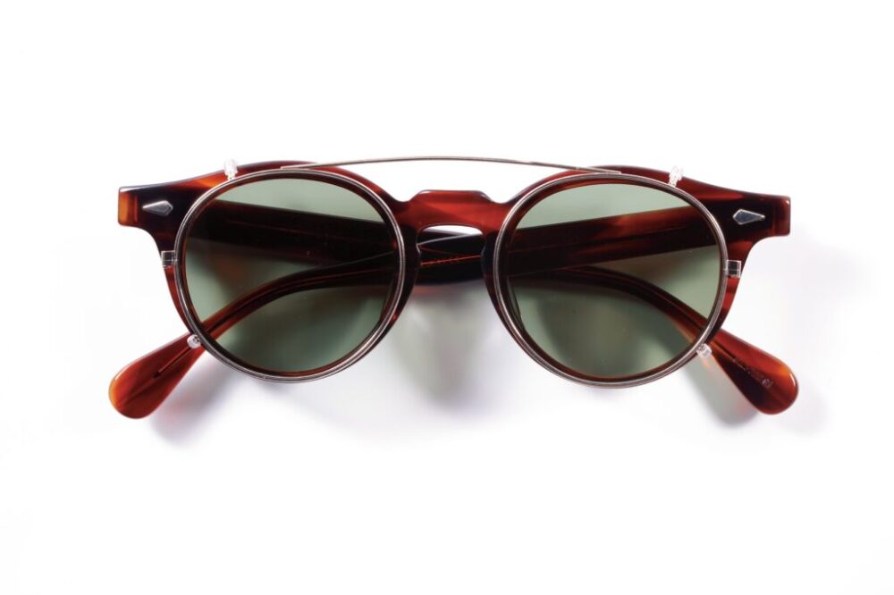 日本製の高品質なチタンを採用し、カラーレンズはオーダーメイド。左右の爪をフレームの縁に引っ掛け、トップブリッジの柔軟性により、着脱も容易に行える。¥28,600_