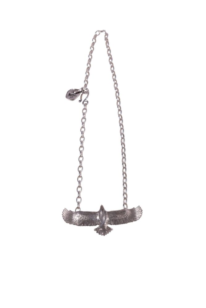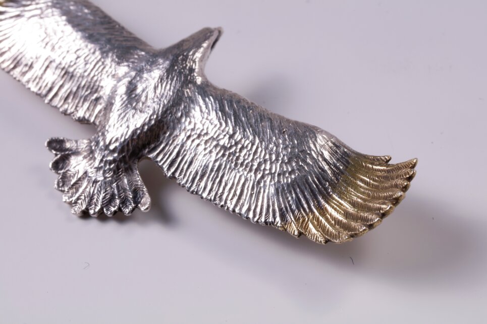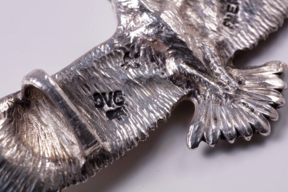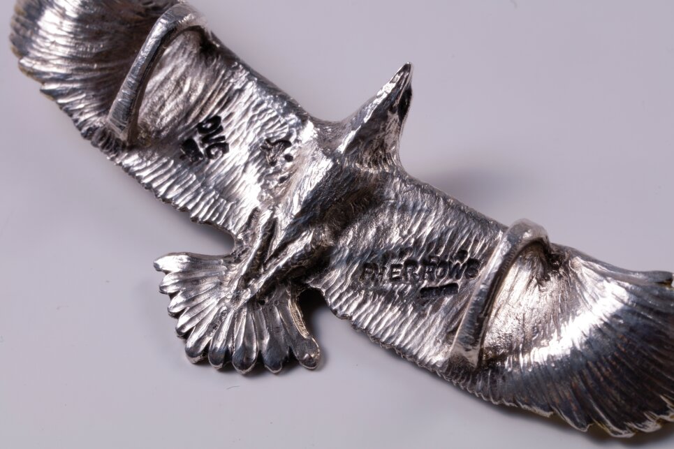ブロック状からナイフ一本で削り出し、大空を羽ばたくイーグルの姿を立体的に表現した渾身の作品。旧くはネイティブアメリカンたちによって作られてきたモチーフだが、翼を広げて優雅に飛ぶ姿をシルバーで表現するのは容易なことではない。