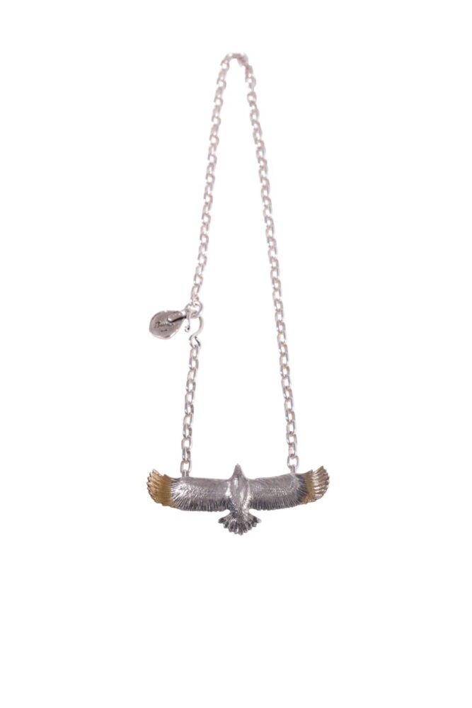 羽の繊細さやリアルな躍動感を追求したイーグルのペンダント。シルバ−925を使用したシンプルなデザインと、シルバ−をベースに翼の先端部分に24K差し鍍金を採用したいわゆる先金デザインの2モデルを制作。チェーンは別売りで留め具のプレートには両ブランドの刻印が入る。¥43780_/¥56,980_(Chain M/¥19,800_,Chain L/¥23,980_)