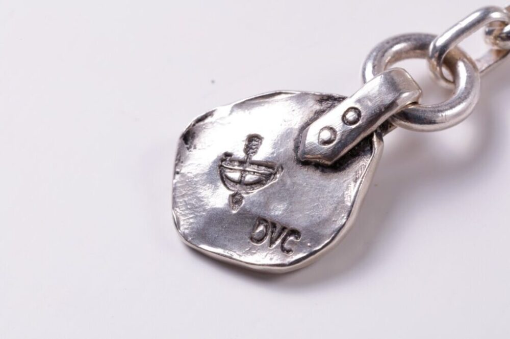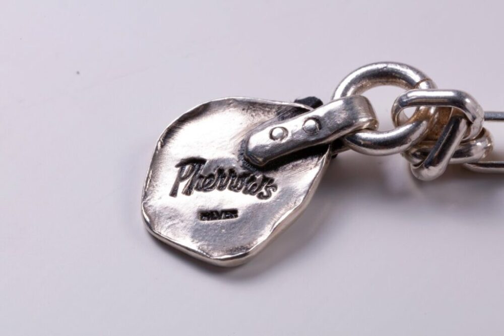 実在するイーグルの画像を様々な角度から研究し、翼の角度や筋肉の動きを正確に捉えることで、繊細で力強いリアルさを追求。素材はシルバー925を使用したソリッドタイプと、翼の先端に24K差し鍍金を付けた2モデル。内側には島田氏のDE-VI CRAFTとPherrow’sがダブルネームで刻まれる。