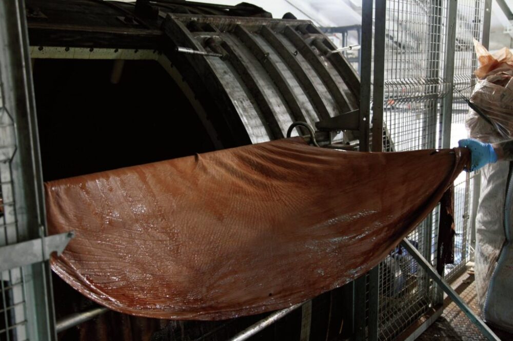 タンニンの配合は企業秘密。GUIDIの革の真髄だ。「うちの革は天然由来なので、犬も食べるよ(笑)」とは代表のグイディ氏。