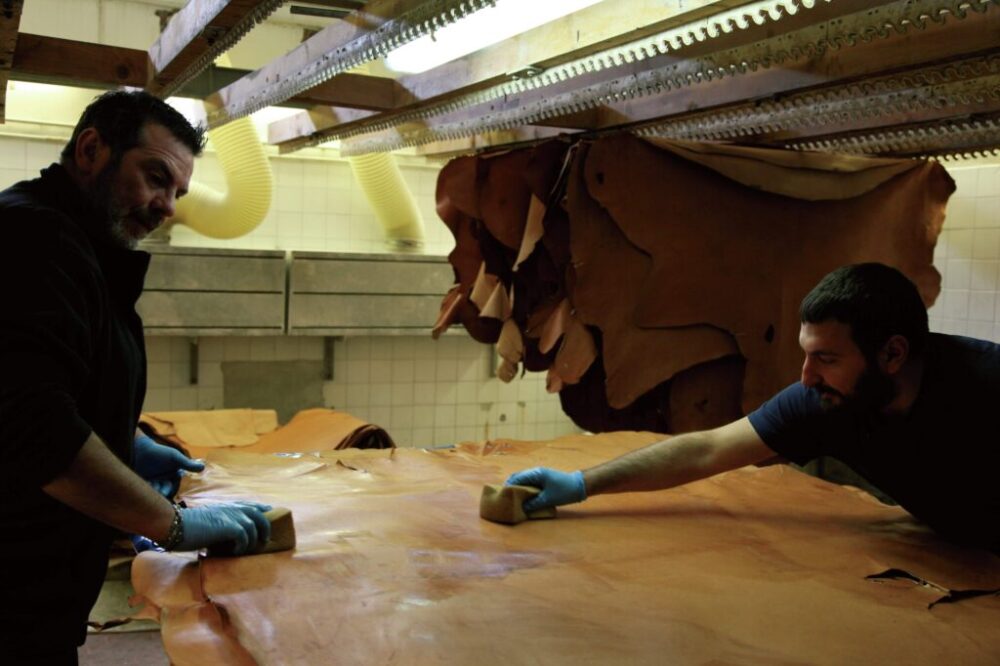 イタリアンレザーの伝統技法「バケッタ製法」。植物タンニンを時間をかけて染み込ませつつ鞣し、油脂分を多く入れることで、特有の風合いを醸し出していく。現在ではタイコを使って革に加脂していくタンナーが多い中、GUIDIでは職人の手によって丁寧に脂を入れていくという昔ながらの手法を採用している。こうした手間暇が、世界中のブランドからオファーの絶えない唯一無二のGUIDIの革を作り上げていくのだ。