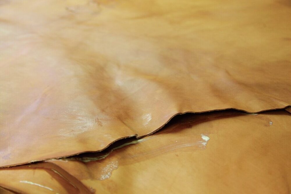 一般的に植物タンニン鞣しの革は硬いというイメージがあるが、油脂分を芯まで含ませることで、しっとりとしなやかな革へと生まれ変わる。