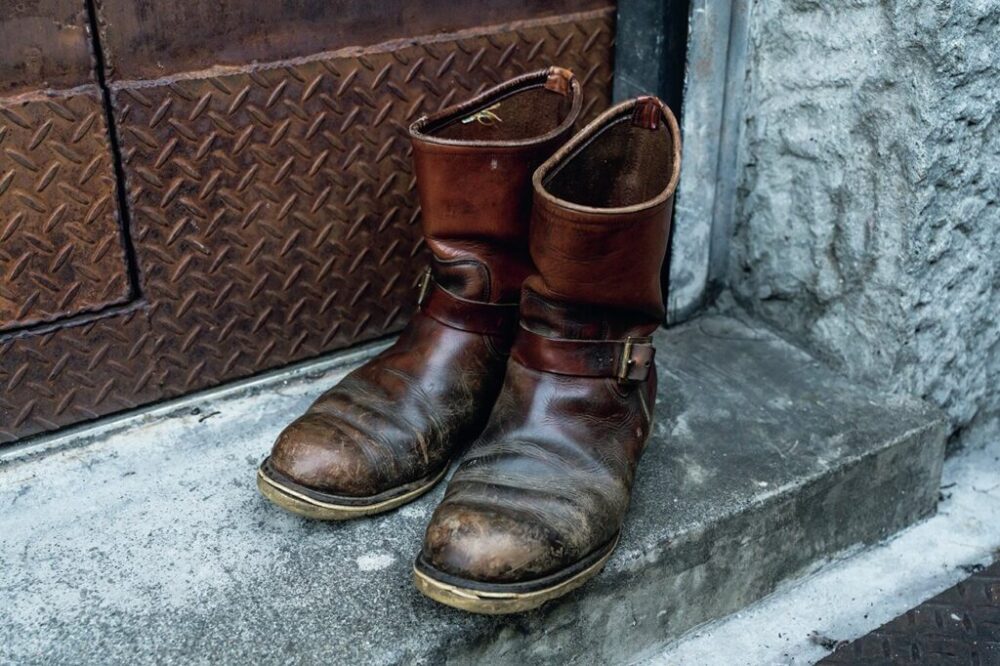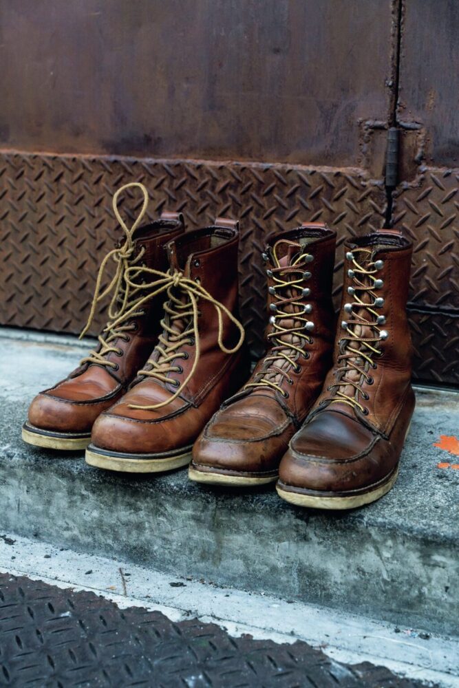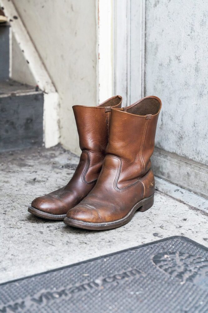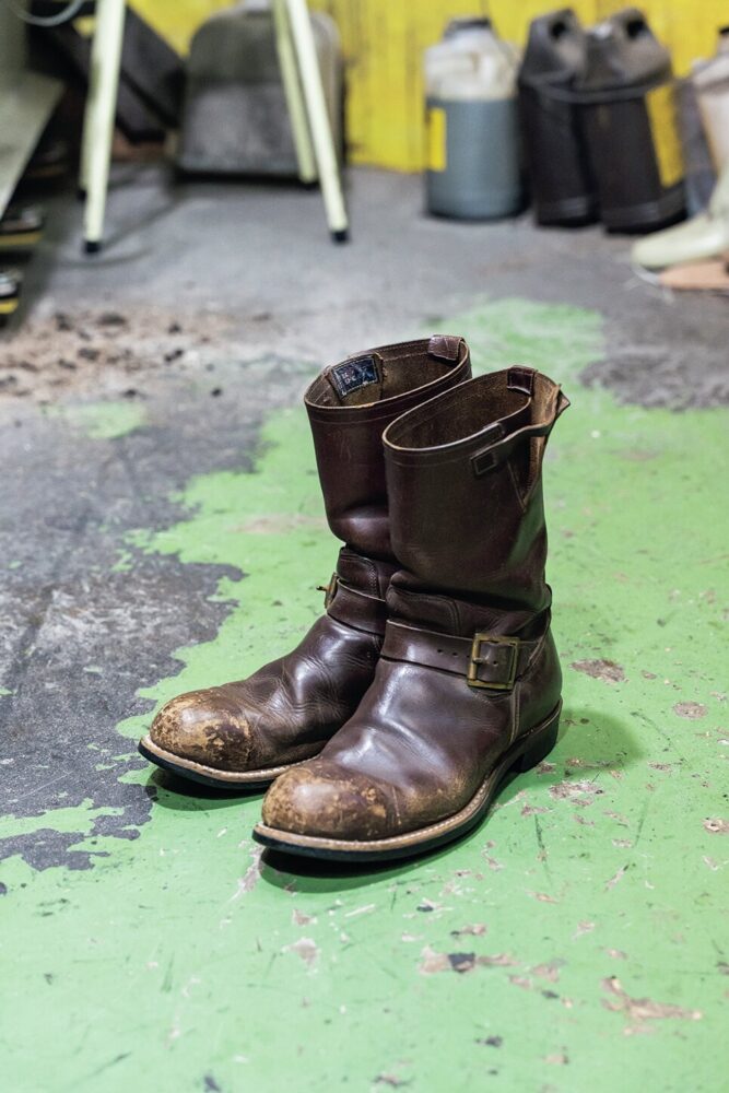 使い込まれたことで色気を放つタフなワークブーツたち。