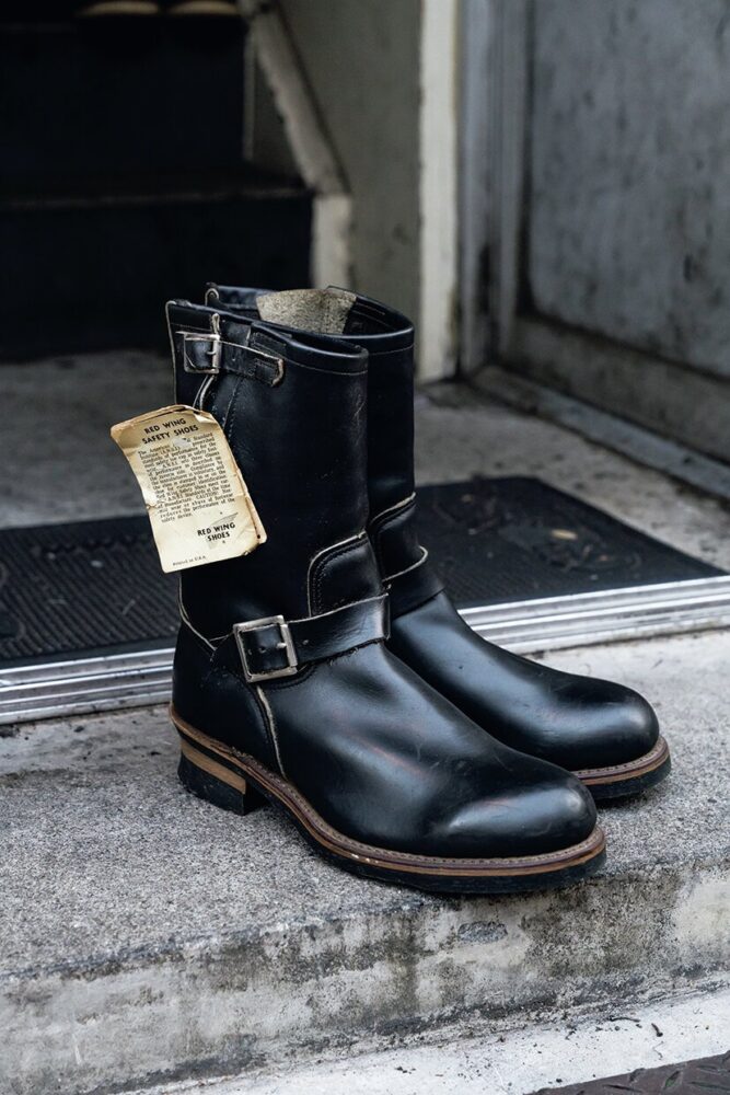 通称紺タグと呼ばれるネイビーカラーの刺繍タグが付いたエンジニアブーツは、ヴィンテージのトップピース。トゥにスチールがないため、シャープな印象。