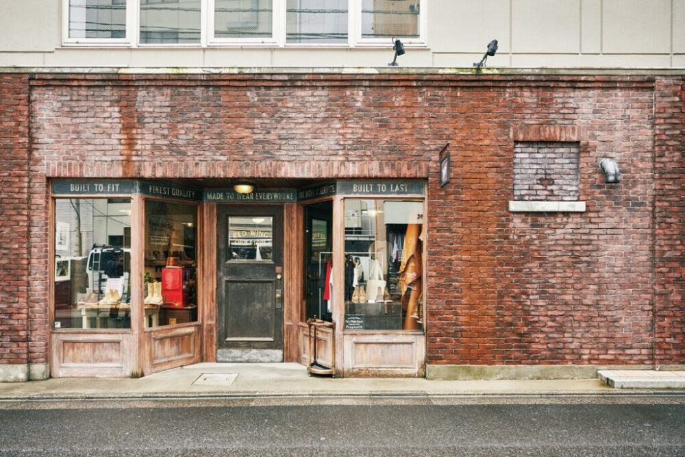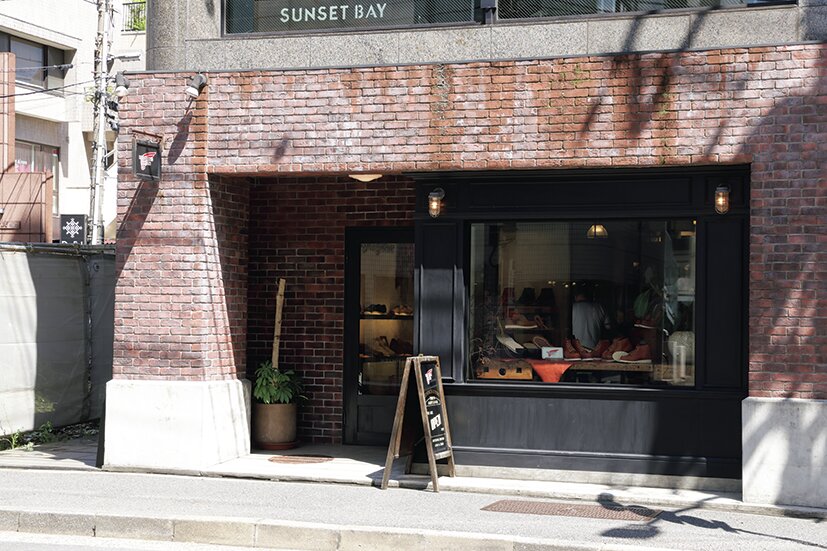2014年にオープンしたRED WINGの旗艦店。ファッション感度の高いセレクトショップや名だたるブランドのフラッグシップショップが並ぶ東京都・港区南青山の骨董通り沿いに位置する。煉瓦作りの壁面を基調とし、ブーツのパーツやアンティークの道具などをオブジェに空間を彩っている。