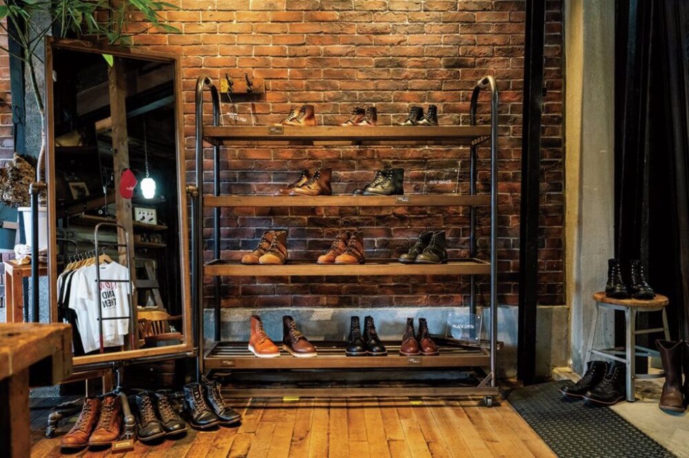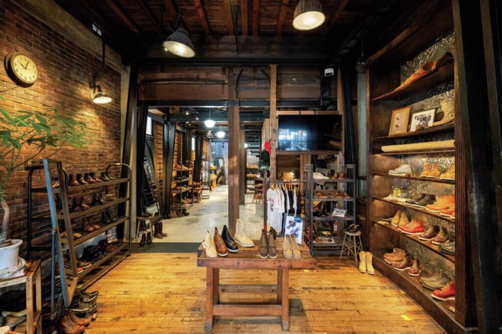 2015年にオープンした国内2店舗目の直営店。建物は1950年代初頭に材木店として建てられたもので、壁や天井の木材などは極力残すことで、RED WINGと同じく、長い歴史を感じさせる空間に仕上がっている。また靴作りに欠かせないヴィンテージのミシン類、製造過程のパーツも雰囲気良し。
