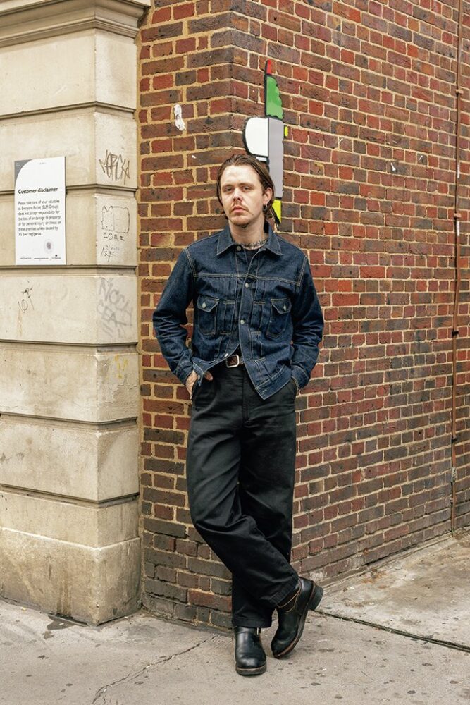 濃紺のデニムジャケットにブラックのパンツ、足元にエンジニアブーツを着用しシックにまとめたスタッフのジェームズ。ハードになり過ぎないコーディネイトのお手本。