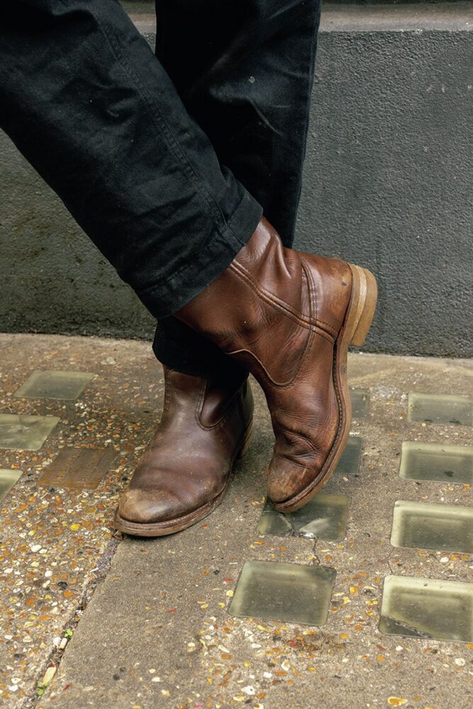 ヒール付きのペコスを愛用するジョージは、ヴィンテージライクな前Vスウェットとシンプルにコーディネイト。エイジングから自身の足によく馴染んでいることがわかる。