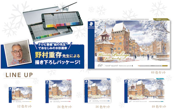 水彩色鉛筆で人気の「カラト アクェレル」から、冬季限定ウインターパッケージが11月から発売される。今年のウインターパッケージは、テレビ番組でも活躍中の水彩画家・野村重存氏がドイツ・ニュルンベルクの冬の街並みを書き下ろしたもの。