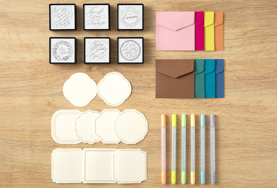 内容:ペインタブルスタンプ浸透印1個、ペインタブルスタンプカラーペン2本(2色×1)、2つ折ミニカード24枚(8種×3)、封筒24枚(8色×3)