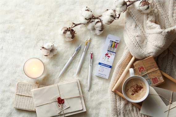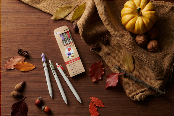 深みのある落ち着いた色の秋・冬限定インク6色と、秋カラー3色セット、冬カラー3色セットがラインナップ。秋カラーとしてパンジー色、ねこじゃらし色、焼きりんご色、冬カラーとしてこなゆき色、きなこもち色、アネモネ色と、街の情景が深みのある色合いになっていくなかで、日常使いのボールペンでも季節感を演出している。