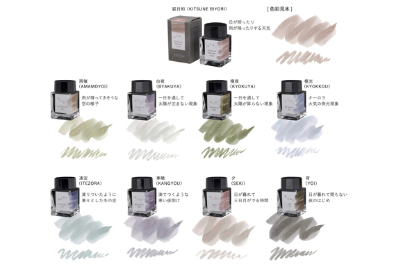 カラーラインナップは全9色。それぞれのインクは色彩がゆらめくように変化していく表情豊かな空をイメージした個性的なカラーが並ぶ。