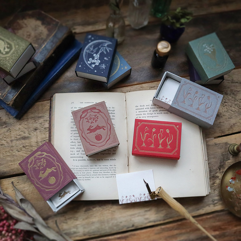 人気の活版印刷のマッチ箱メモに北海道モチーフのラベンダー柄が登場。ミニ便箋やスタンプなどをバイキングスタイルで自分好みに。