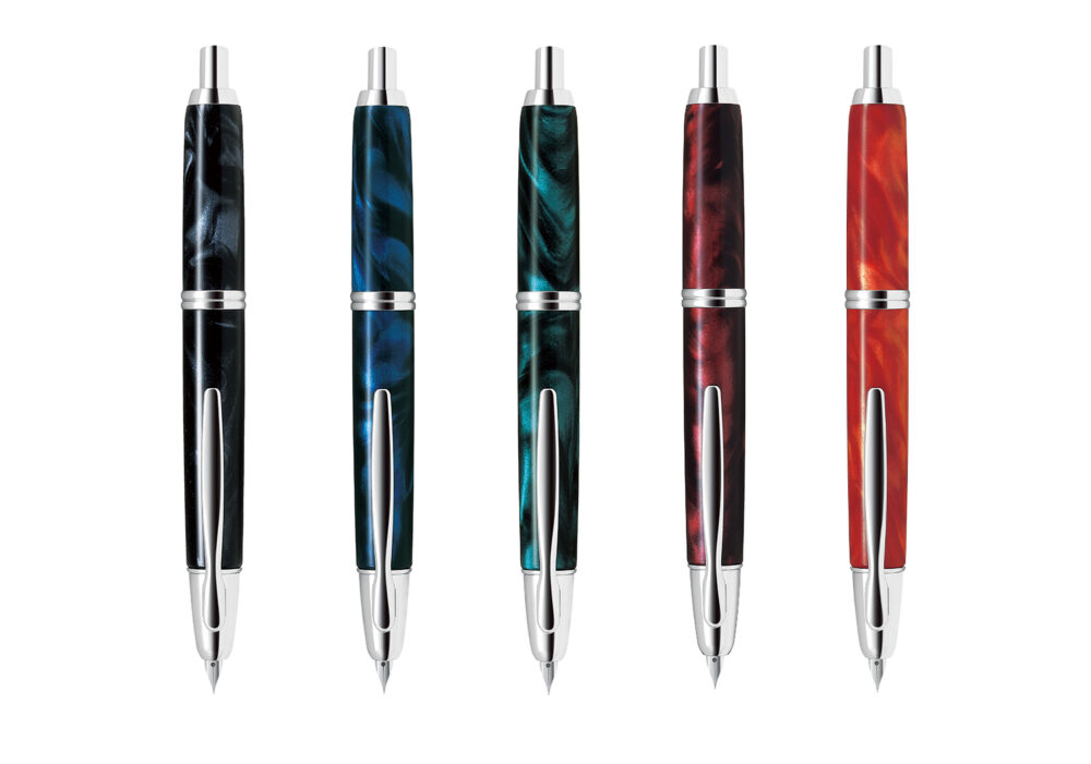 今回発売する「キャップレスSE」は、キャップが不要なノック式で、ワンノックですばやく書くことができる「キャップレス」の特長はそのままに、1本ごとに異なるマーブル模様が特長の万年筆。2種類の樹脂を混ぜ固めて、切削、研磨することで現れる華やかなマーブル模様は、1本として同じ柄はなく、個性的で愛着が湧くデザインとなっている。