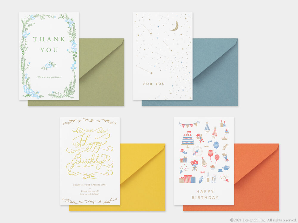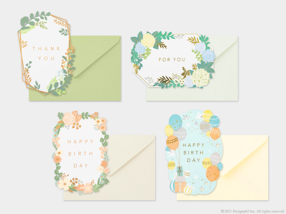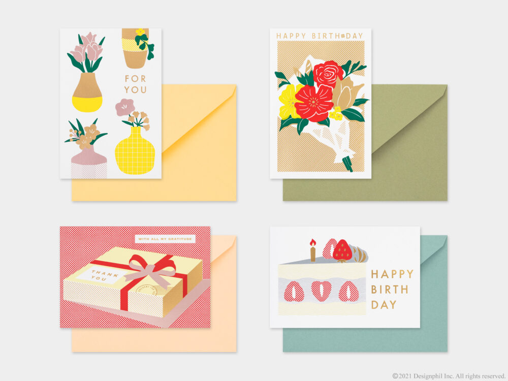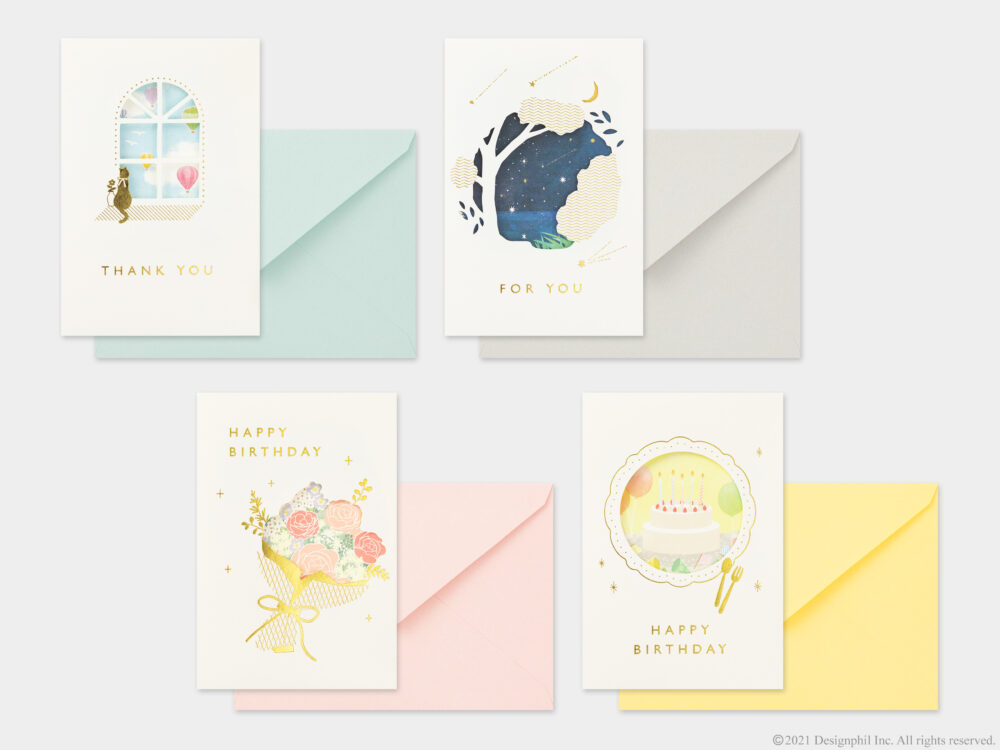 開くことでデザインの変化を楽しめる窓付きのカード。カードの表紙に抜きの加工を施し、閉じた状態と開いた状態で異なるデザインを楽しむことができる。花束の絵柄を開くと一面のお花畑が見えたり、お皿に乗ったケーキの絵柄を開くと明るく賑やかなパーティーの様子が見えたりと、カードを開くことでストーリーを感じることができる全4柄。