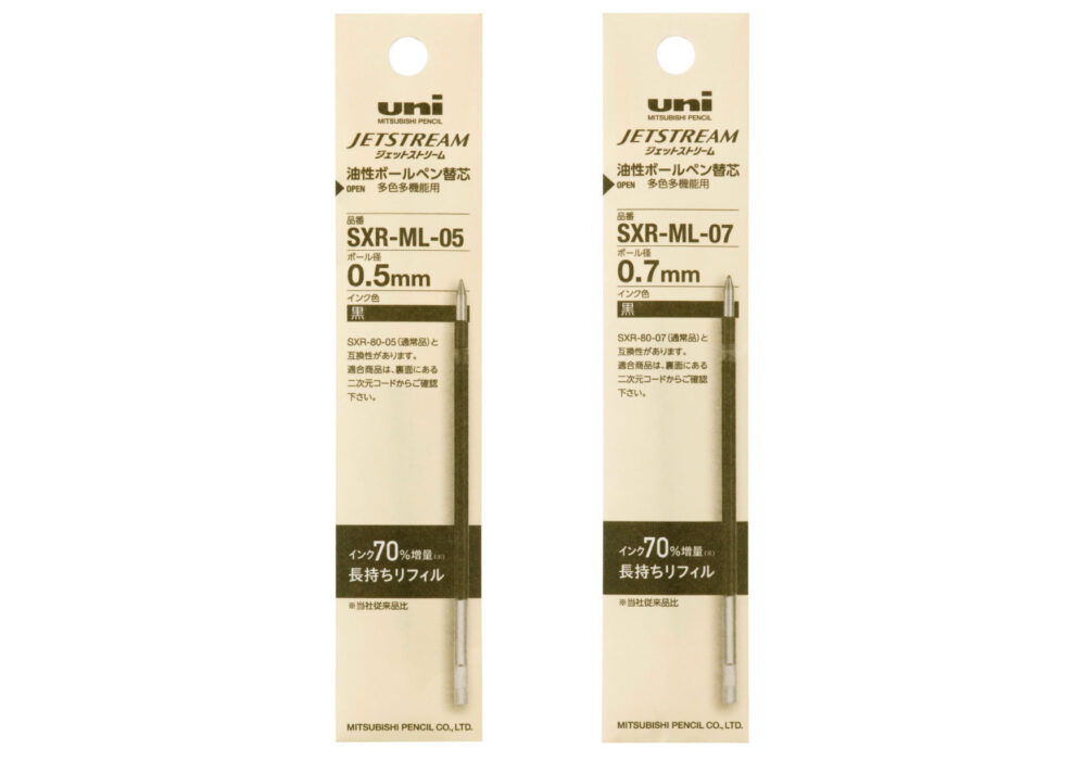 同時に黒インク約70%増量の「長持ちリフィル」も発売。リフィルのチューブを薄くすることにより同社通常品(SXR-80)と同じ形状で互換性を保ったままインク量をアップし、通常品比で約70%の増量に成功。チューブが薄くなることで、プラスチック使用量も通常品に比べ約30%減量、加えてパッケージには、三菱鉛筆として初めて紙製パッケージを使用し、環境へ配慮した商品となっている。