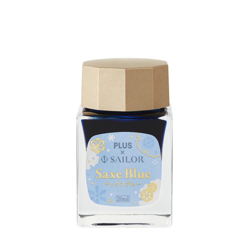 雪をイメージし、新たに調色した限定サックスブルーです。ほんの少しくすみがかった淡いブルーはノートのクリーム色の中紙にもきれいに発色、色の濃淡が楽しめます。また、ラベルは雪の結晶をイメージしたデザインにゴールドの箔押しがあしらわれています。使い切りやすく、かわいらしい20mlのミニボトル入り。