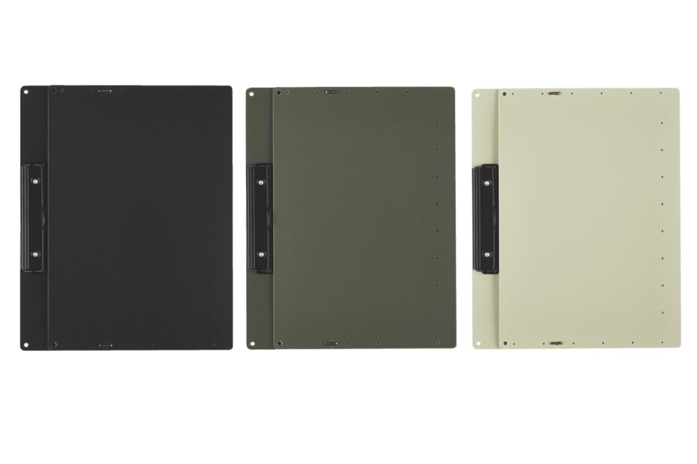 ゴムバンド付きなので、屋外での使用時にA3用紙が風に煽られにくく、また、A4サイズで持ち運ぶ際には、表紙止めとなる。作業中についた汚れが落としやすいよう、表面は細かいシボ加工で仕上げ、カラーは汚れが目立ちにくく、オフィスワークでも使いやすいブラック、カーキ、ベージュの3色が揃う。