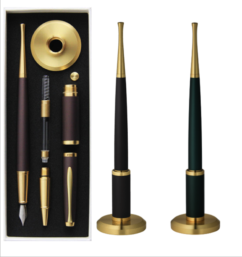 ドイツ製のペン先とリフィルで書き味が抜群、アルマイト処理したアルミ製の軽量ボディに真鍮製のスタンド。スタイリッシュで高級感あるデザインとなっている。
