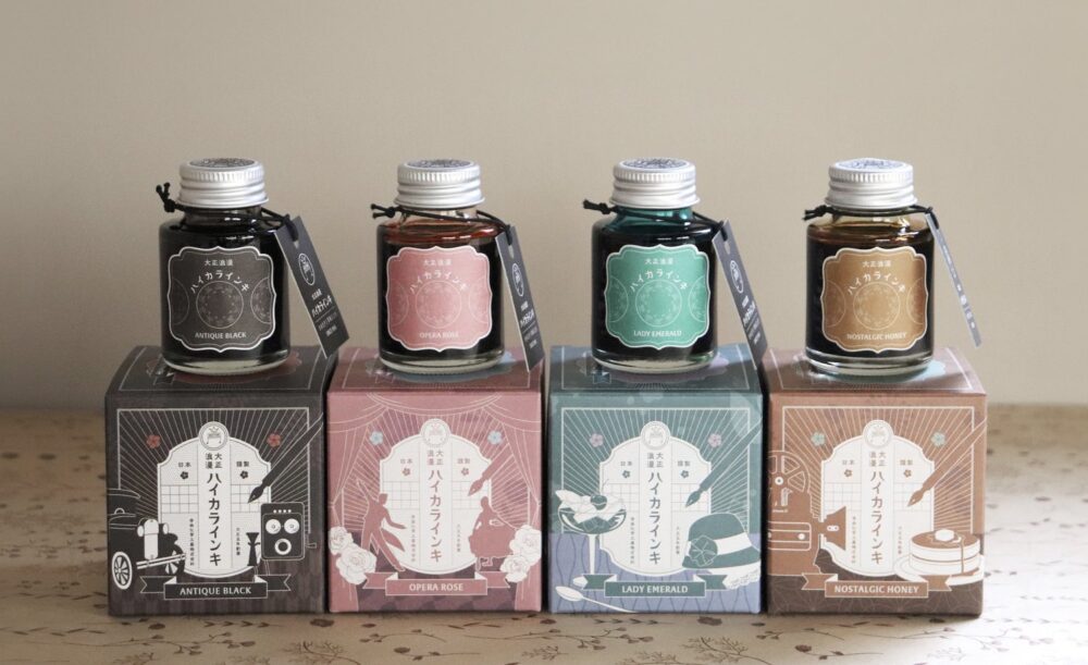 2021年に販売を開始した万年筆インキ「ギター 大正浪漫ハイカラインキ」シリーズに新色が登場。大正浪漫を連想させるレトロな色合いが美しい「アンティークブラック」「オペラローズ」「レディエメラルド」「ノスタルジックハニー」の計4色。