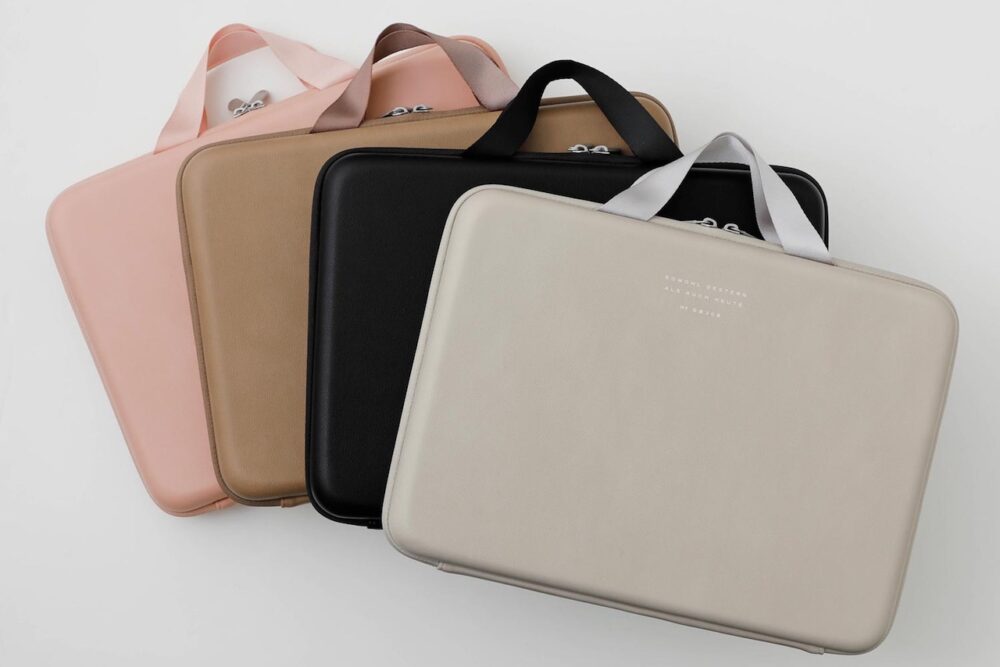丸みを帯びたフォルムとリボンのようなハンドルがやわらかい印象のセミハードPCバッグ。弾力のある素材が中身を優しく守る。内側は5つのポケットに仕切られ、14インチまでのノートPCのほか、アダプタやマウス、ケーブルなども収納しながらの整理が叶う。