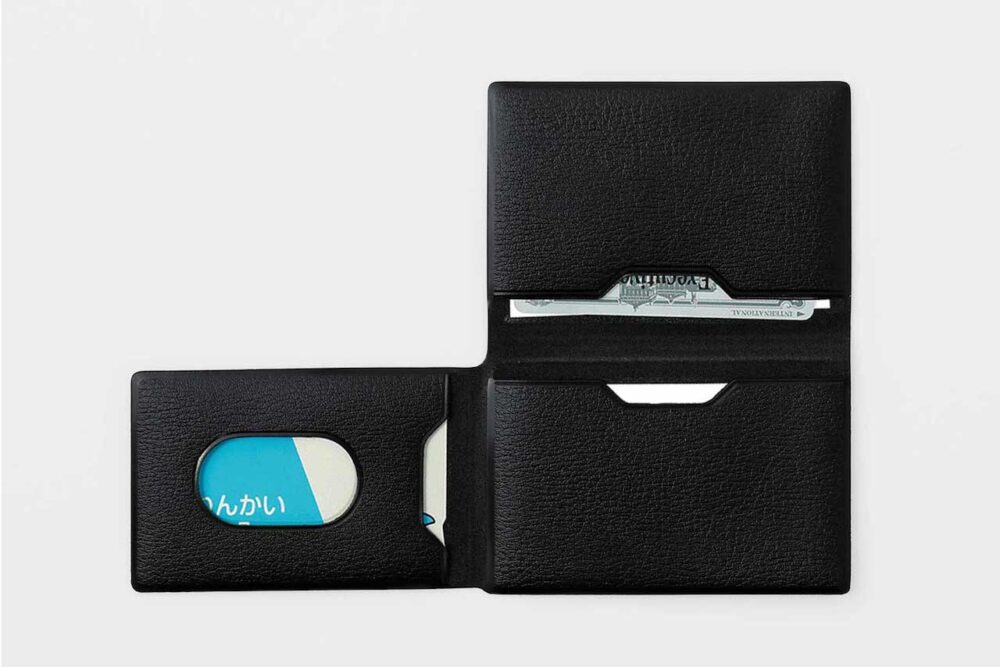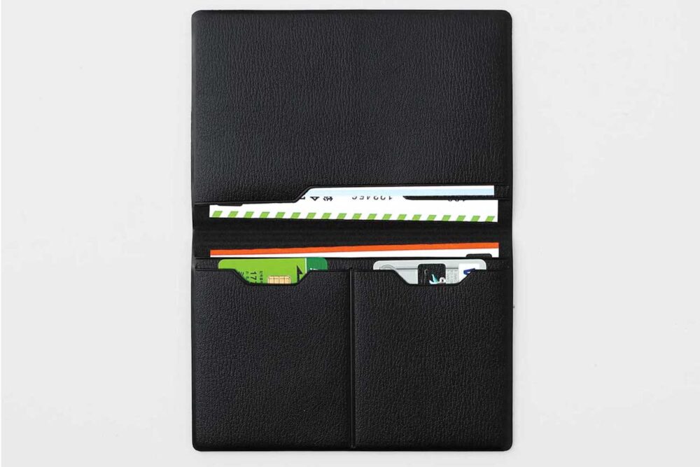 3つのポケットを備えたパス&カードケース。見開き両面のポケットには名刺やカードを、窓穴付きの折り返しポケットには定期券やICカードを収納できる。取り出しやすいよう各ポケットには切り込みを、水濡れや汚れに強いPVC素材を使用。