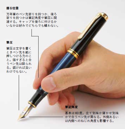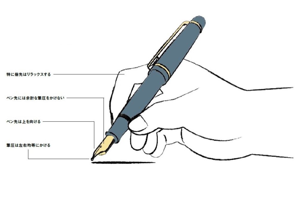 万年筆の持ち方は原則として自由だが、筆圧がほとんど必要のない万年筆であるからこそ注意も必要。油性ボールペンで書く時と同じような感覚で強い筆圧をかけると、ペン先が左右に開いたまま戻らなくなったり、全体が湾曲してしまうことがある。万年筆の重さを利用して、余分な力を入れずにリラックスして書くように心がけよう。
