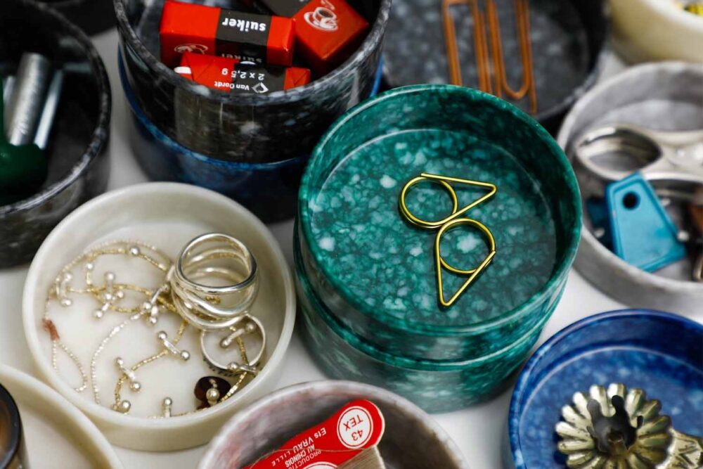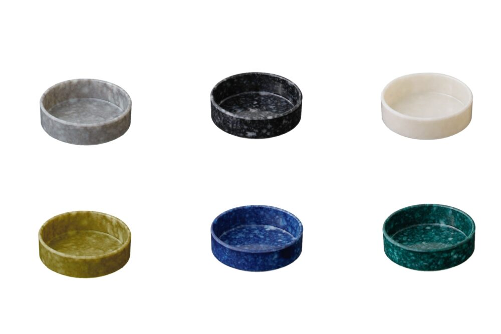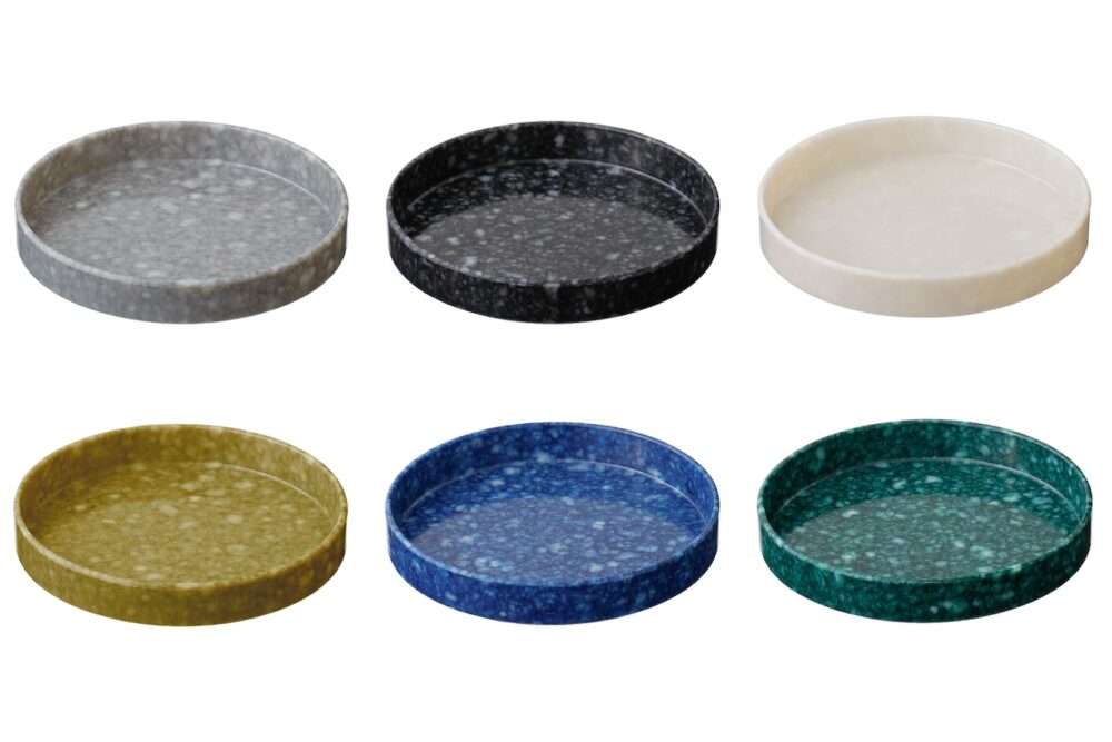 マーブル柄や色の濃淡に個体差があり、味わいのある表情が魅力。落ち着いた渋めのカラーバリエーションでインテリアにも馴染む。アイボリーは直営店限定カラーだ。高さ違いのスタッキングトレイは、小物にあわせ積み重ねて収納したり、デスクトレイと組み合わせて文具やコスメ収納にもおすすめ。