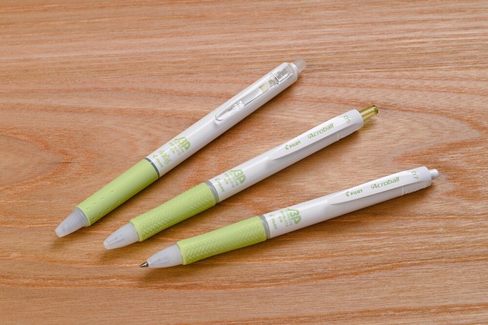 商品は、なめらかな書き味とカスレのない書き出しが特長の低粘度油性インキ「アクロインキ」を採用した油性ボールペン「アクロボールTシリーズ」と、摩擦熱で筆跡を消去できる筆記具「フリクションボールノック05」の人気の2商品をベースとし、とうもろこしや小麦などの穀物を原料にした「バイオマスプラスチック」をボディの後軸に使用。