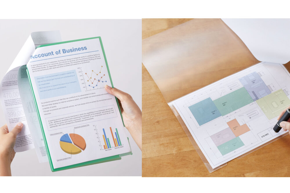 キングジムはこれらの課題に着目し、書類を収納したままホチキス留めされた資料のようにナナメにめくって閲覧・記入ができるファイルとホルダーの2種類を開発した。