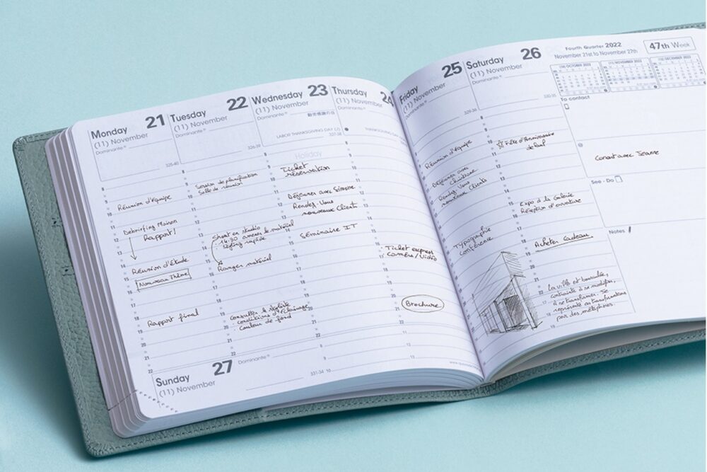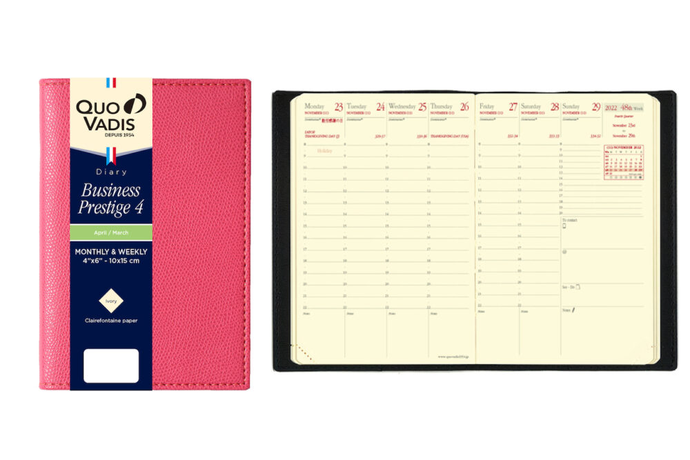 エレガントで落ち着いたアイボリーペーパーのプレステージライン。 手に馴染むサイズに、曜日ごとに設けられたノートスペースが便利なダイアリー。