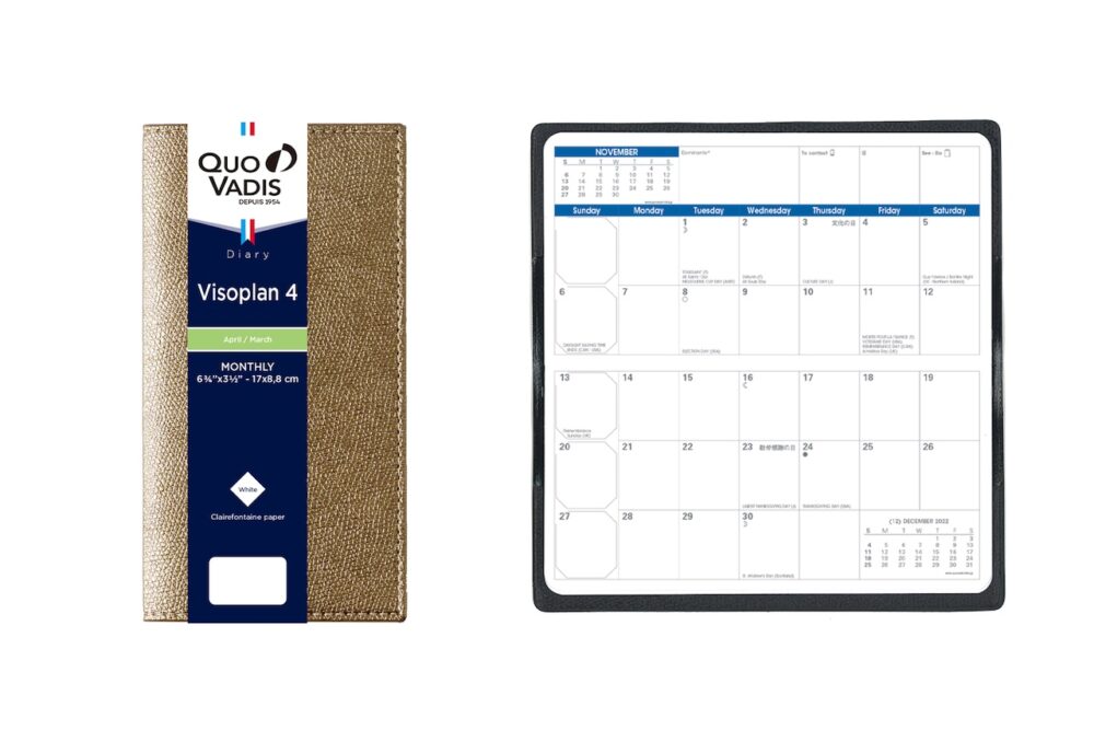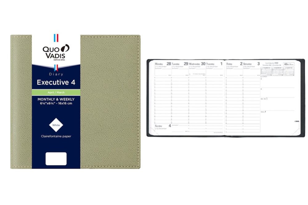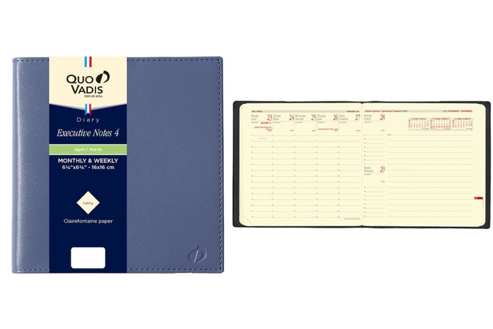 クオバディスといえばこのユニークな正方形サイズ。半世紀以上も愛されつづけるアジェンダプランニングの機能性を最も実感できるダイアリー。印刷色がブルーとグレーの2色からグレー1色に変更。
