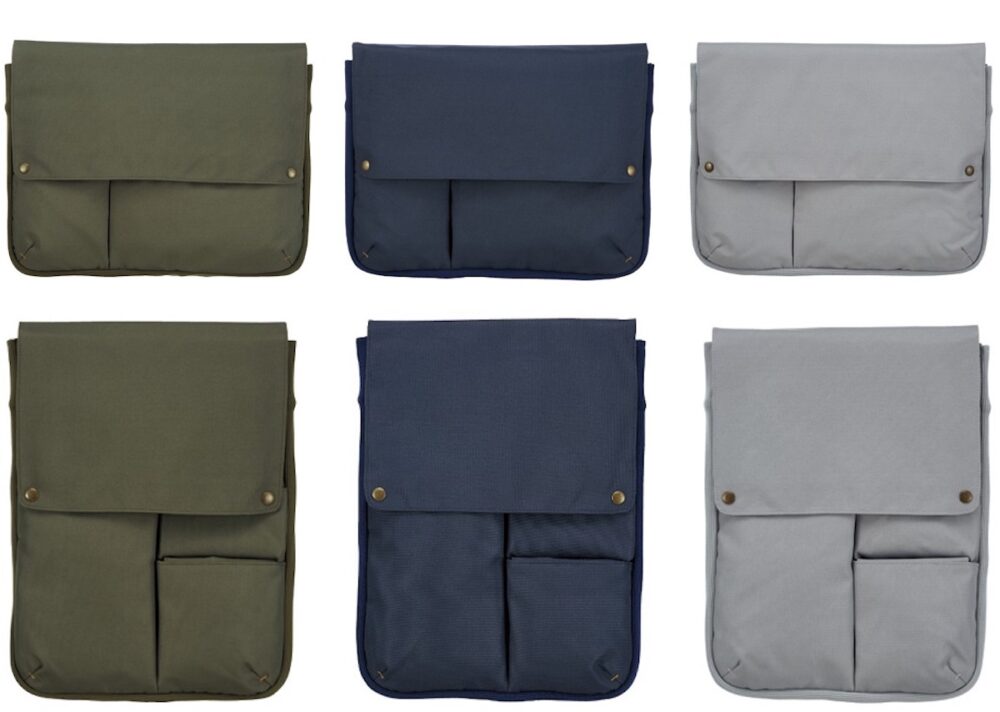 13.3インチまでのノートパソコンを収容できるサイズで、手持ちのバッグやワークスタイルに合わせて選べる、ヨコ型とタテ型の2タイプを用意。カラーバリエーションは、オフィスでも自宅でもインテリアとのなじみが良い、オリーブグリーン、スモーキーネイビー、アッシュグレイの3色となっている。
