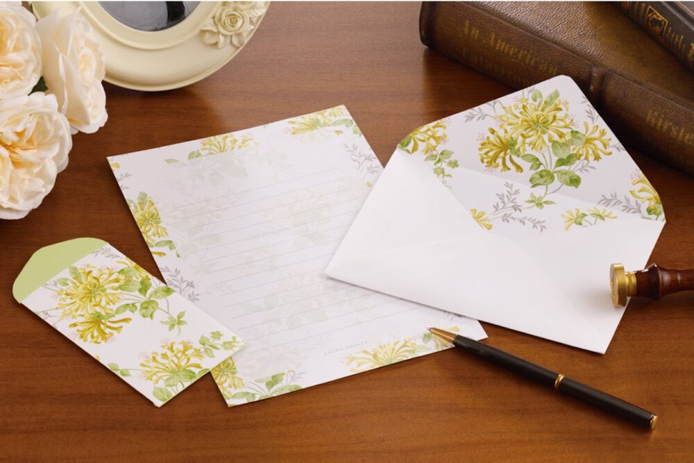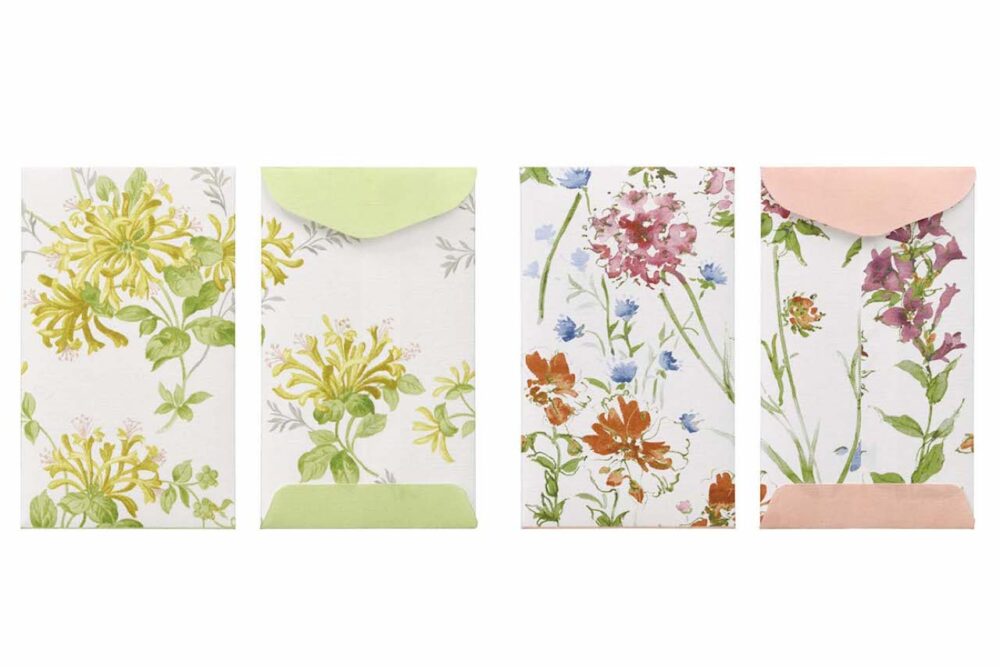 今回、黄色い花が特徴的で爽やかな雰囲気の「ハニーサックル」、英国の野草が鮮やかに描かれる「ワイルドメドウ」、の2柄を採用した『レターセット』と『ぽち袋』を新たに発売する。