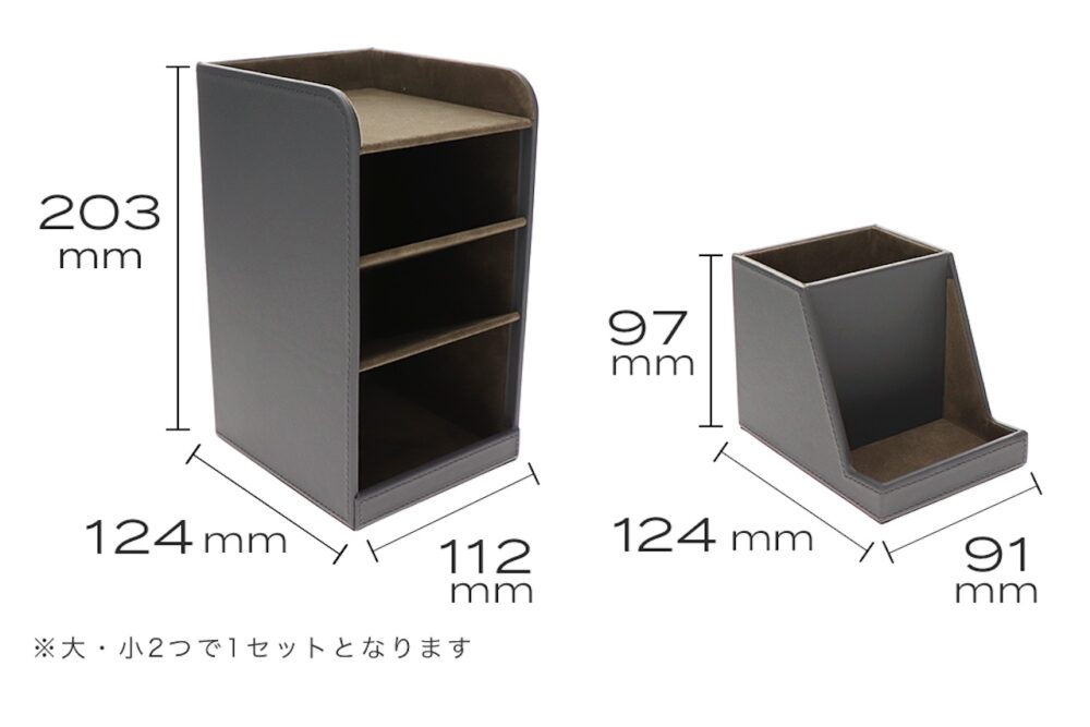サイズ違いのオーガナイザー2つがセットとなっているので、2つ並べても、1つはデスク、1つはリビングにと使い分けても便利な商品。コンパクトなサイズでありながら収納性が高く、小物をまとめることができる。