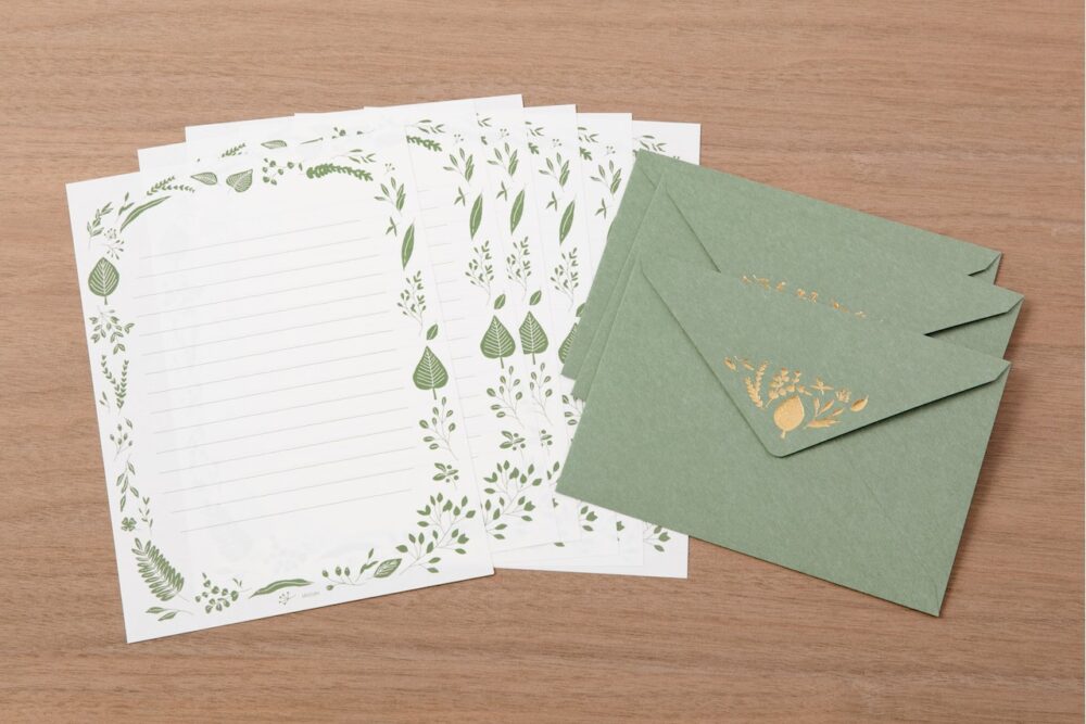上品な草花をデザインした便箋と封筒のセット。和紙のような柔らかな 風合いの便箋に、親しみのある草花を繊細に描かれている。封筒のフラップには金や銀の箔押しを施し、手紙を受け取ったときの特別感を演出。